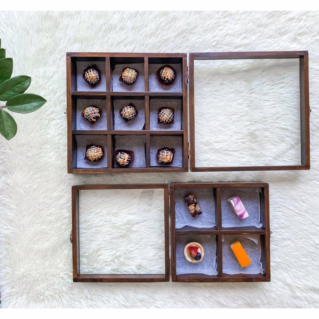 ล่องไม้ กล่องฝากระจก แบ่งช่อง 4 ช่องหรือ 9 ช่องกล่องไม้สนทั้งกล่อง ฝาทำจากกระจก เลือกขนาดได้มีสีให้เลือก สีวอลนัท สีไม้สัก สีเชอร์รี่ สะมัฮอกกานีในแบบจะเป็นสีวอลนัทนะคะ