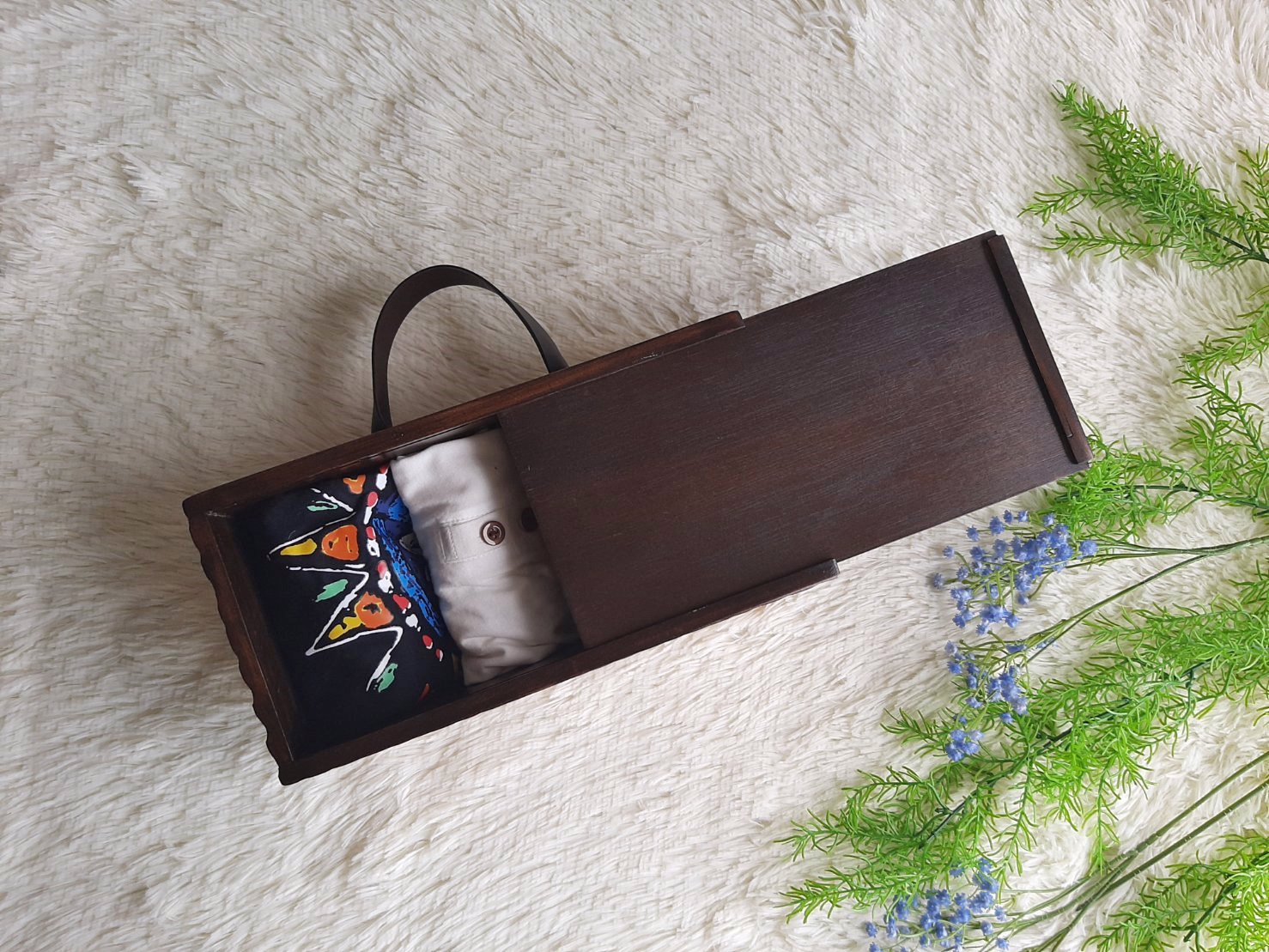 กล่องไม้ฝาสไลด์ดึงออกด้านข้าง มีสายหิ้วจับสะดวกในการพกพาเดินทาง