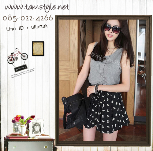 Dress059-เดรสแฟชั่น แขนกุด ด้านบนสีเทา กระโปรงพิมลาย สีดำ อก 32-33 ((เดรสแฟชั้นพร้อมส่ง))