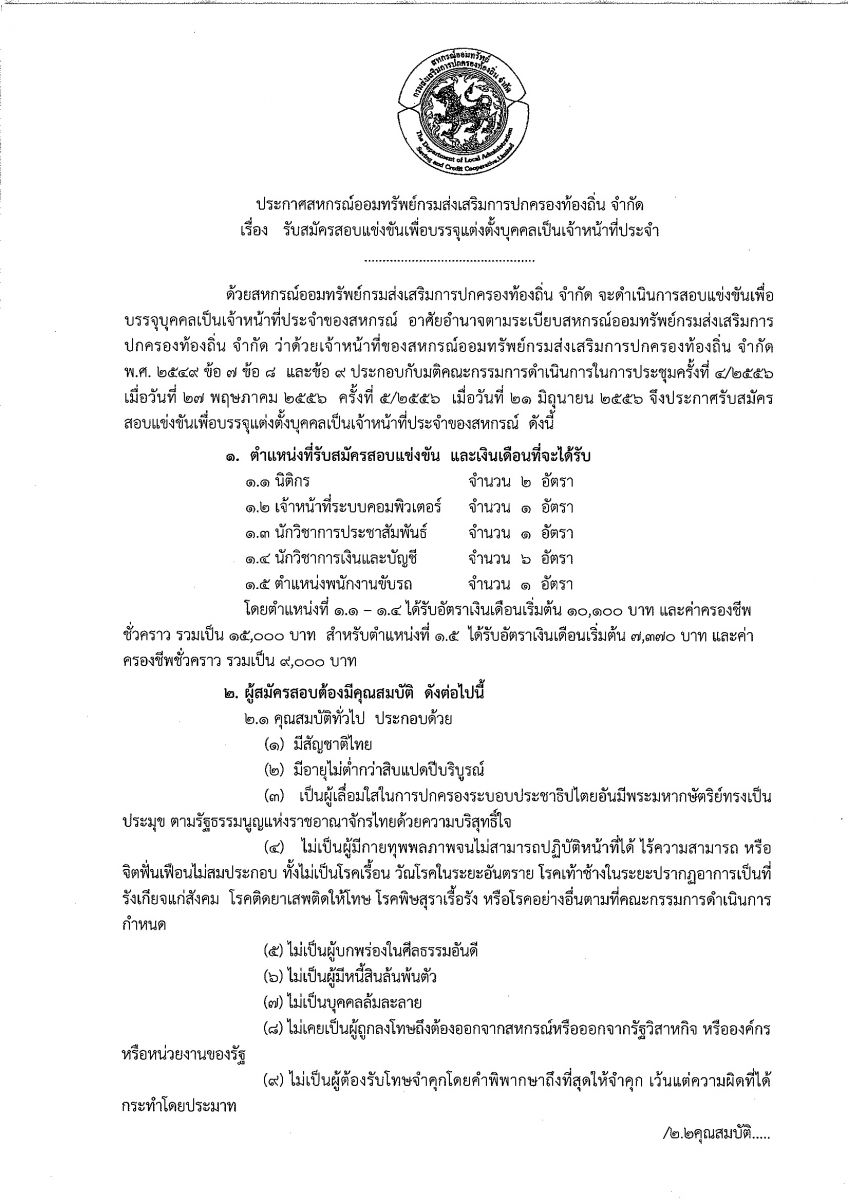 ประกาศสหกรณ์ออมทรัพย์กรมส่งเสริมการปกครองท้องถิ่นจำกัด ประกาศรับสมัครสอบแข่งขันเพื่อบรรจุแต่งตั้งบุคคลเป็นเจ้าหน้าที่ประจำของ สหกรณ์ตำแหน่ง