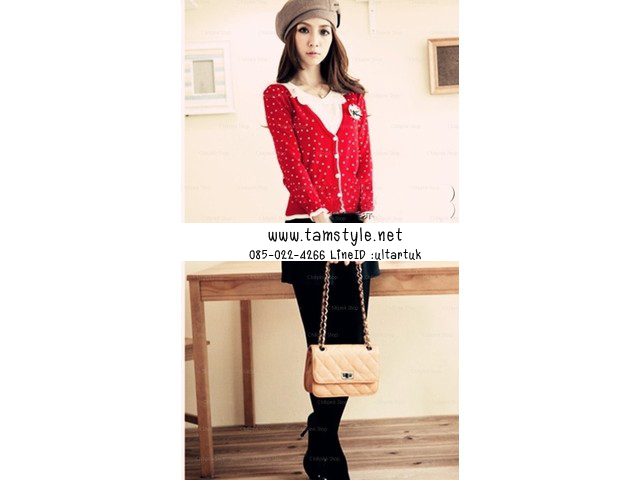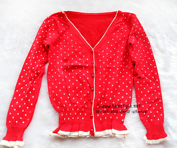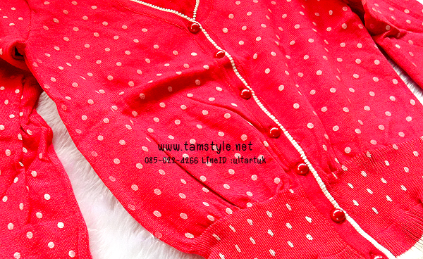 Coat-017 เสื้อคลุมไหมพรม Cardigan สีแดง ลายจุด Polka dot สีขาว