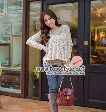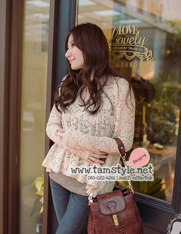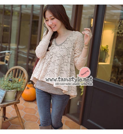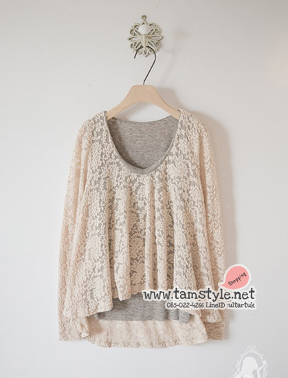 Top -077 เสื้อแฟชั่น เสื้อแขนยาว ด้านนอกเป็นลูกไม้สีนู้ด ด้านใน เป็นผ้าcotton สีเทา