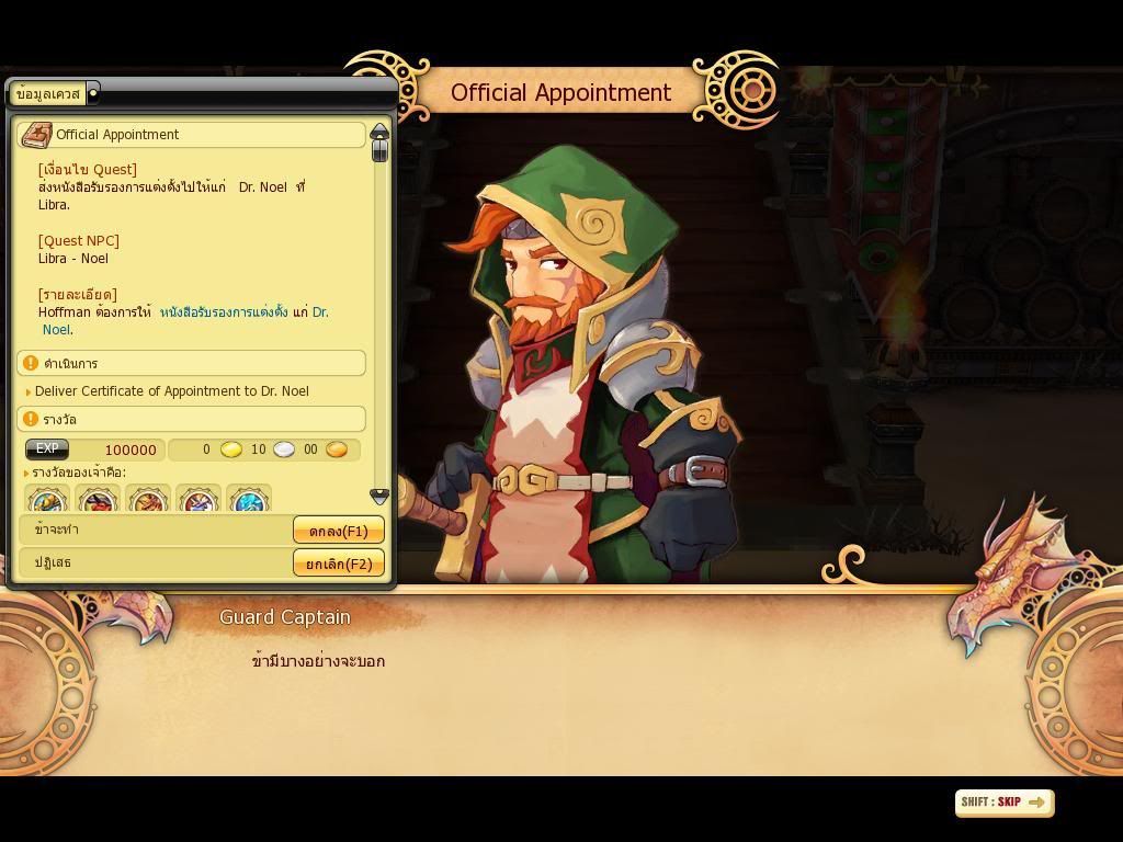 ต่อมาจะสังเกตว่า เควสแดงที่ NPC นั้นจะหายไป แล้วรับที่ใครหล่ะ ต่อมาให้มารับกับคนนี้ครับ NPC Hoffman