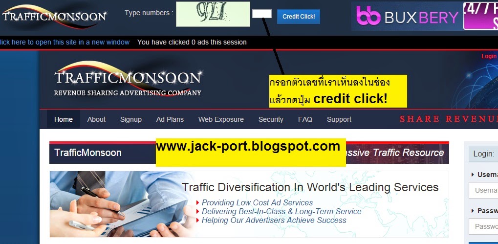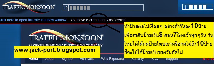 Trafficmonsoon ผู้ก่อตั้งคือ Charles Scoville (เจ้าของเว็บ AdHitProfits) เปิดบริการเดือนตุลาคม 2014 เมื่อสมัครแล้วให้เข้าไปคลิ๊ กรับป้ายเงินฟรีประจำวันให้กดไปที่ My Account แล้วคลิ๊กให้หมดครับ ระบบจะส่งมาให้ทุกวันอาจจะมากหรือน้อยแล้วแต่บางวัน แต่ทุกวันจะต้องได้ 5-10 ป้ายฟรีๆ รวมแล้วจะได้วันละ 0.15-0.25$เลยทีเดียวเยอะกว่าเว็บคลิกทั่วไปมาก 10-15วันก็สามารถสะสมยอดถอนขั้นต่ำได้2$แบบสบายๆ