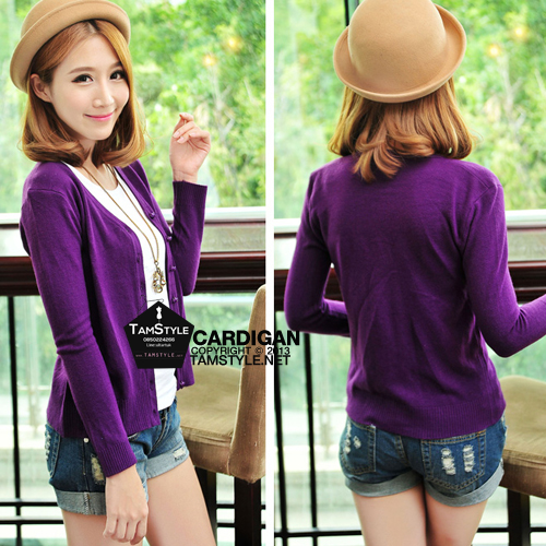 Coat-205 เสื้อคลุมไหมพรมกระดุมมุก แขนยาว สีม่วงมังคุด นิ่มใส่สบาย กันแดด กันลมสบายจ้า อก 35" ยาว 23 " (เสื้อคลุมพร้อมส่ง)