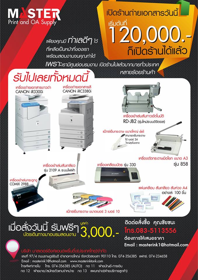 เปิดร้านถ่ายเอกสารวันนี้เริ่มต้นที่ ราคา 120,000.- ก็เปิดร้านได้แล้วเพียงคุณมีทำเลดีๆไว้ที่เหลือเป็นหน้าที่ของเรา พร้อมสอนงานจนคุณทำได้ เพราะเรามีศูนย์อบรมงาน เปิดร้านไปแล้วมากมายทั่วประเทศ หลายร้อยร้านค้ารับไปเลยทั้งหมดนี้ -เครื่องถ่ายเอกสารขาวดำ CANONiR3300i