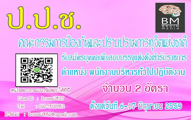 สำนักงาน ป.ป.ช. รับสมัครบุคคลเพื่อสอบบรรจุแต่งตั้งเข้ารับราชการ ตำแหน่ง พนักงานบริหารทั่วไปปฏิบัติงาน ตั้งแต่วันที่ 6-17 มิถุนายน 2559