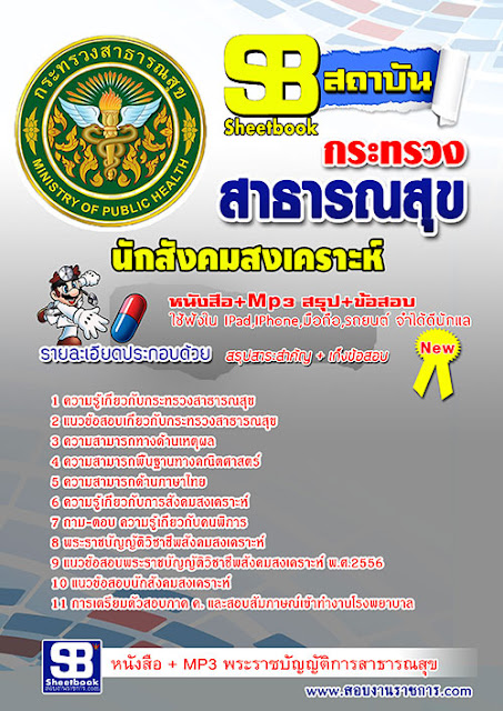 แนวข้อสอบ นักสังคมสงเคราะห์ กระทรวงสาธารณสุข (สสจ)1 ความรู้เกี่ยวกับกระทรวงสาธารณสุข2 แนวข้อสอบเกี่ยวกับกระทรวงสาธารณสุข3 ความสามารถทางด้านเหตุผล4 ความสามารถพื้นฐานทางคณิตศาสตร์5 ความสามารถด้านภาษาไทย6 ความรู้เกี่ยวกับการสังคมสงเคราะห์7 ถาม-ตอบ ความรู้เกี่ยวกับคนพิการ8 พระราชบัญญัติวิชาชีพสังคมสงเคราะห์9 แนวข้อสอบพระราชบัญญัติวิชาชีพสังคมสงเคราะห์ พ.ศ.255610 แนวข้อสอบนักสังคมสงเคราะห์11 การเตรียมตัวสอบภาค ค. และสอบสัมภาษณ์เข้าทำงานโรงพยาบาล