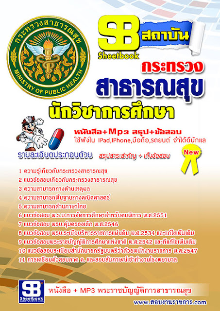 แนวข้อสอบนักวิชาการศึกษา กระทรวงสาธารณสุข (สสจ)1 ความรู้เกี่ยวกับกระทรวงสาธารณสุข2 แนวข้อสอบเกี่ยวกับกระทรวงสาธารณสุข3 ความสามารถทางด้านเหตุผล4 ความสามารถพื้นฐานทางคณิตศาสตร์5 ความสามารถด้านภาษาไทย6 แนวข้อสอบ พ.ร.บ.การจัดการศึกษาสำหรับคนพิการ พ.ศ.25517 แนวข้อสอบ พรบ.คุ้มครองเด็ก พ.ศ.25468 แนวข้อสอบ พรบ.ระเบียบริหารราชการแผ่นดิน พ.ศ.2534 และแก้ไขเพิ่มเติม9 แนวข้อสอบพระราชบัญญัติการศึกษาแห่งชาติ พ.ศ.2542 และที่แก้ไขเพิ่มเติม10 แนวข้อสอบระเบียบสำนักนายกรัฐมนตรีว่าด้วยพนักงานราชการ พ.ศ.254711 การเตรียมตัวสอบภาค ค. และสอบสัมภาษณ์เข้าทำงานโรงพยาบาล