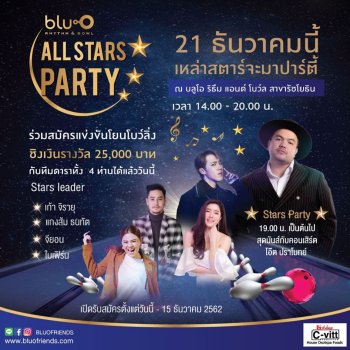 "Blu-O All Star Party" ในวันที่ 21 ธันวาคม 2562 ตั้งแต่เวลา 14.00 น. เป็นต้นไป ณ บลูโอ ริธึม แอนด์ โบว์ล ชั้น 4 เมเจอร์ ซีนีเพล็กซ์ รัชโยธิน เตรียมพบกับ ดาราชื่อดัง อาทิ