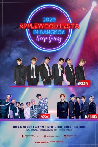 "2020 Applewood Festa In Bangkok : Keep Going" วันที่ 18 มกราคม 2563 เวลา 18.00 น. ณ อิมแพ็ค เมืองทองธานี บัตรราคา 1800 / 2800 / 3800 / 4800 / 5500 บาท จำหน่ายบัตรที่เคาน์เตอร์ เซอร์วิส ใน เซเว่น อีเลฟเว่น หรือเว็บ allticket.com