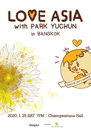"Love Asia with Park Yuchun in Bangkok" ในวันที่ 25 มกราคม 2563 เวลา 19:00 น. ณ แจ้งวัฒนะฮอลล์ ศูนย์การค้าเซ็นทรัลพลาซา แจ้งวัฒนะ บัตรราคา 2000 / 3000 / 4000 / 5000 บาท ทาง thelimethailand.com