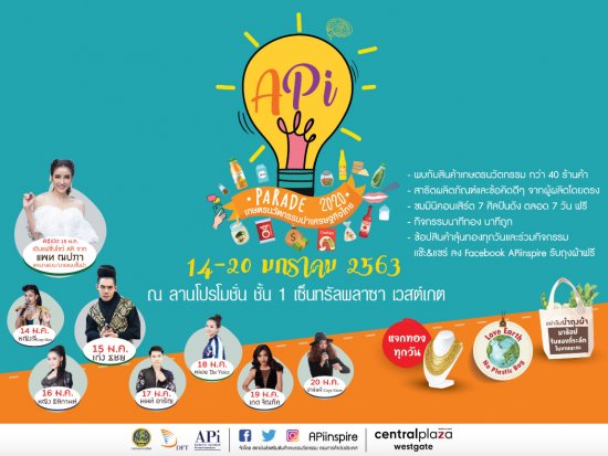 สถาบันส่งเสริมสินค้าเกษตรนวัตกรรม (APi) กรมการค้าต่างประเทศ เตรียมจัดงาน "APi Parade 2020" เกษตรนวัตกรรมนำเศรษฐกิจไทย ในระหว่างวันที่ 14 20 มกราคม 2563 ณ ลานโปรโมชั่น ชั้น 1 ศูนย์การค้าเซ็นทรัลพลาซา เวสต์เกต ขนทัพสินค้าเกษตรนวัตกรรมกว่า 40 ร้าน ให้เลือกชม ชิม ช้อป กันจุใจ