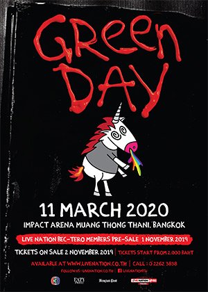 "Green Day Live in Bangkok 2020" วันที่ 11 มีนาคม 2563 เวลา 20.30 น. ที่ อิมแพ็ค เมืองทองธานี