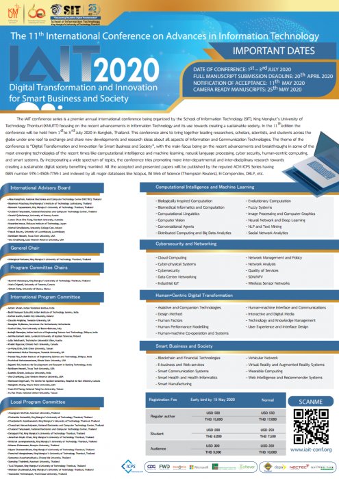 คณะเทคโนโลยีสารสนเทศ มหาวิทยาลัยเทคโนโลยีพระจอมเกล้าธนบุรี มีกำหนดจัดการประชุมวิชาการระดับนานาชาติ "The 11th International Conference on Advances in Information Technology 2020 (IAIT2020) ภายใต้ "THEME: Digital Transformation and Innovation for Smart Business and Society" ระหว่างวันที่ 1 3 กรกฎาคม 2563 ทั้งนี้เพื่อเปิดโอกาสให้นักวิชาการ นักวิจัยระดับนานาชาติ ได้นำเสนอผลงานวิจัย ที่เกี่ยวกับสาขาเทคโนโลยีสารสนเทศ และเป็นเวทีกลางในการเสวนาร่วมกันระหว่างมหาวิทยาลัย และหน่วยงานต่าง ๆ ระดับนานาชาติ