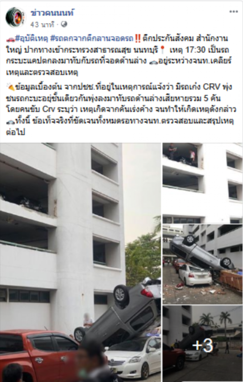 เมื่อเวลา 17 30 ที่ผ่านมาที่เพจ ข่าวคนนนท์ ได้รายงานว่าเกิดหตุ รถตกจากตึกลานจอดรถ ตึกประกันสังคม กระทรวงสาธารณสุข เป็นรถกระบะแคปตกลงมาทับกับรถที่จอดด้านล่าง จนท.เคลียร์เหตุแล้ว อยู่ระหว่างตรวจสอบเหตุ