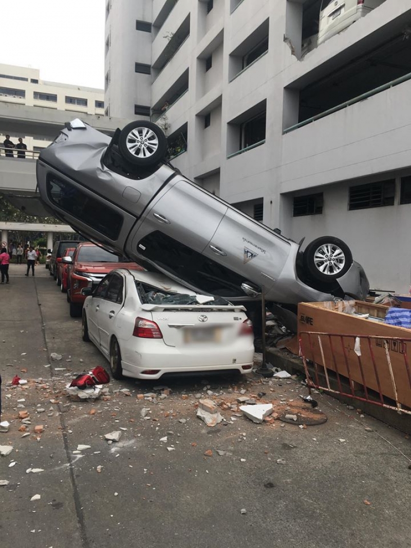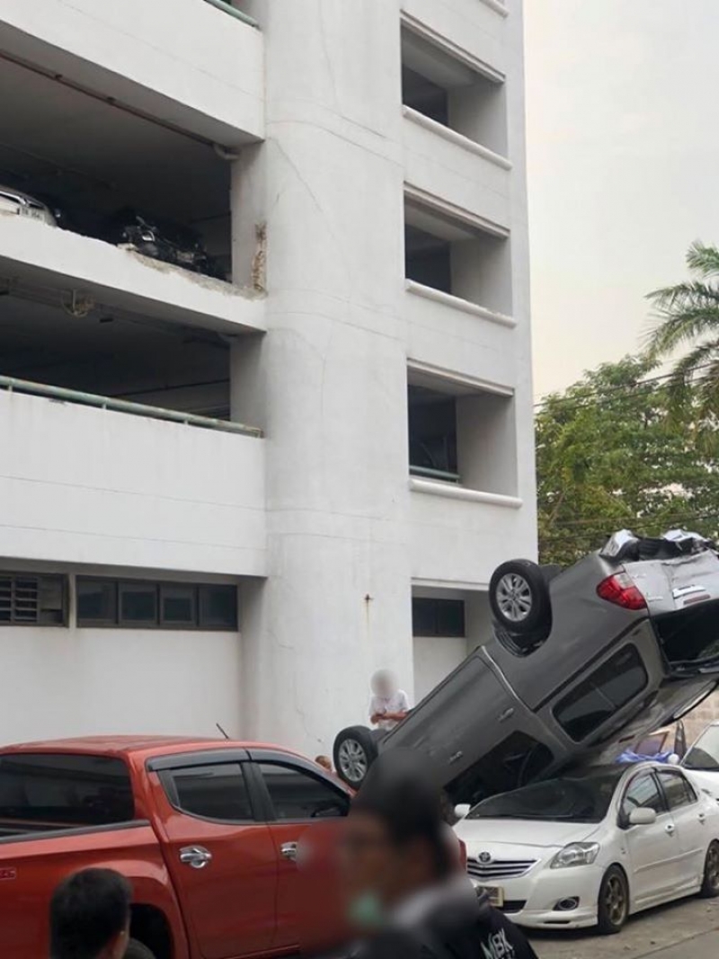 ข้อมูลเบื้องต้น จากปชช ที่อยู่ในเหตุการณ์แจ้งว่า มีรถเก๋ง CRV พุ่งชนรถกระบะอยุ่ชั้นเดียวกันพุ่งลงมาทับรถด้านล่างเสียหายรวม 5 คัน โดยคนขับระบุว่า เหตุเกิดจากคันเร่งค้างตอนสตาร์ท จนทำให้เกิดเหตุดังกล่าว