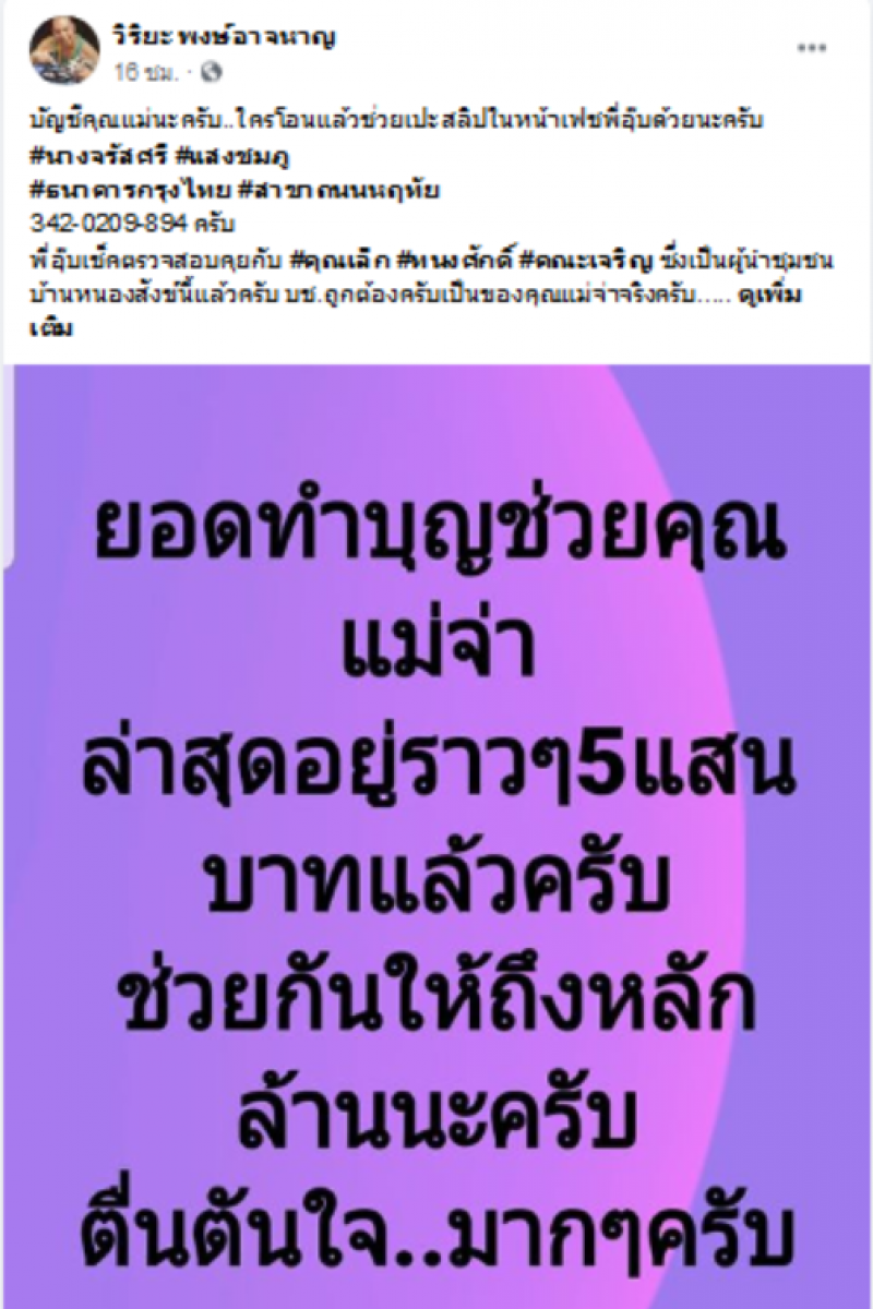 ล่าสุดเฟสบุ๊คที่ใช้ชื่อว่า วิริยะ พงษ์อาจหาญ ได้เปิดจำนวนเงินล่าสุดที่จะช่วยเหลือแม่จ่าจักร เป็นจำนวนเงินราวๆ5แสนบาทแล้ว