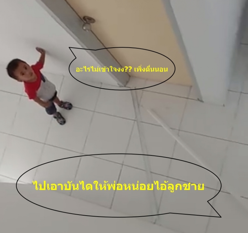 ในตอนแรกคุณพ่อชาวโซเชียลรายนี้ไม่รู้ว่าบุตรชายตื่นนอนแล้วก็ทำงานต่อไป กระทั่งเมื่อซ่อมเสร็จแล้วกำลังเตรียมจะลง พอมองลงมากลับเจอหน้าบุตรชายแหงนหน้ามองขึ้นมาพร้อมกับบันไดที่วางไกลจากจุดเดิมมาก โดยคุณพ่อชาวโซเชียลพยายามบอกให้บุตรชายเอาบันไดมาวางที่เดิมให้พ่อ แต่ดูเหมือนบุตรชายจะไม่เข้าใจและไม่ทำตามที่พ่อบอกเลย ได้แต่ยืนแหงนหน้ามองพ่ออย่างเดียว
